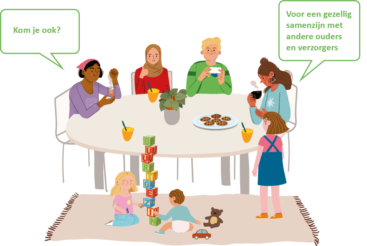 Iedere 1e dinsdag van de maand van 10.00 - 11.30 uur is er een ontmoetingsmoment voor ouders en verzorgers. Ook kinderen zijn van harte welkom! Er is genoeg ruimte en speelgoed aanwezig. We drinken samen een bakkie en praten over de mooie en minder mooie kanten van het ouderschap.