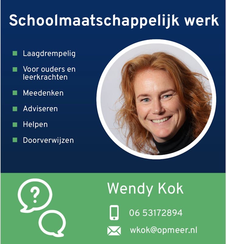 Vanaf dit schooljaar is zij vaker op school te vinden en is zij ook gestart met een inloopspreekuur. Zij vormt de brug tussen de school en hulp bij opgroeien en opvoeden voor ouders, leerkrachten én kinderen en biedt laagdrempelige hulp vanuit de scholen.
