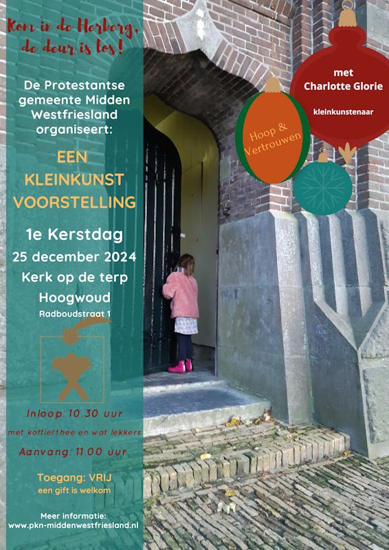 De Protestantse Gemeente Midden Westfriesland organiseert op eerste Kerstdag een kleinkunstvoorstelling met medewerking van Charlotte Glorie.