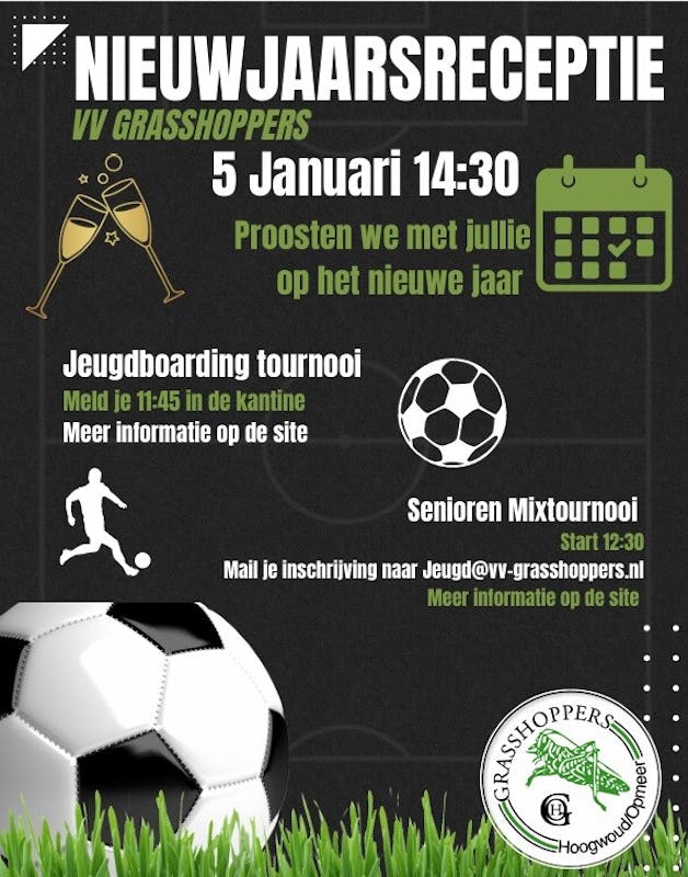 Iedereen die Grasshoppers een warm hart toedraagt is uitgenodigd voor de nieuwjaarsreceptie op 5 januari 2025 vanaf 14.30.