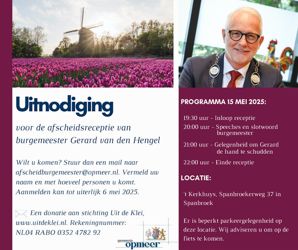 Graag nodigen we alle inwoners en ondernemers uit de gemeente Opmeer uit voor de afscheidsreceptie van burgemeester Gerard van den Hengel. De receptie vindt plaats op donderdag 15 mei om 19.30 uur in 't Kerkhuys in Spanbroek aan de Spanbroekerweg 37.
