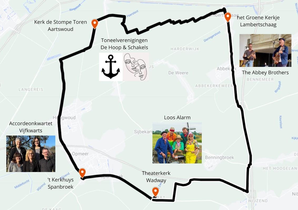 ’s Middags voert de route u door het schilderachtige lintdorp Spanbroek of over de Zomerdijk met haar eindeloze groene weides. Ook nu kiest u zelf uw startpunt: ’t Kerkhuys in Spanbroek of Theaterkerk Wadway.