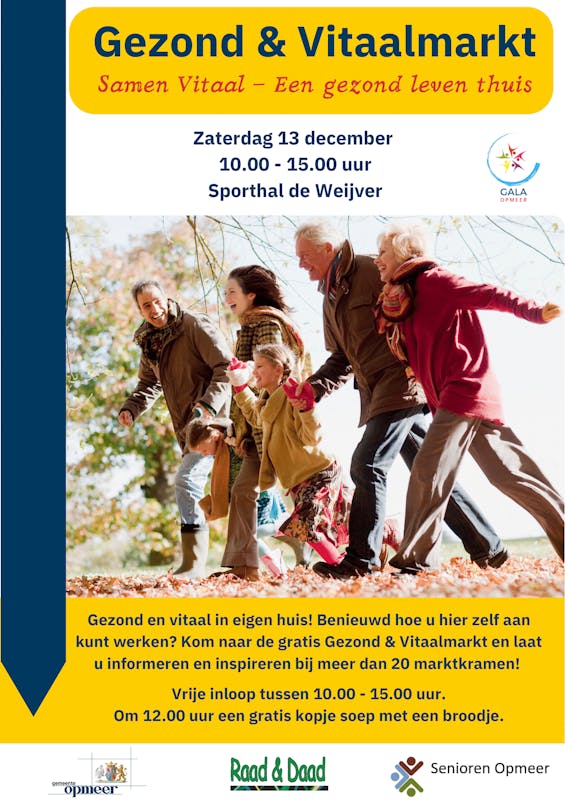 Gezond en vitaal in eigen huis. Benieuwd hoe u hier zelf aan kunt werken? Kom naar de gratis Gezond & Vitaalmarkt en laat u informeren en inspireren. Ook Raad & Daad staat hier met een marktkraam om u te informeren over de hulp die onze vrijwilligers u hierbij kunnen bieden.