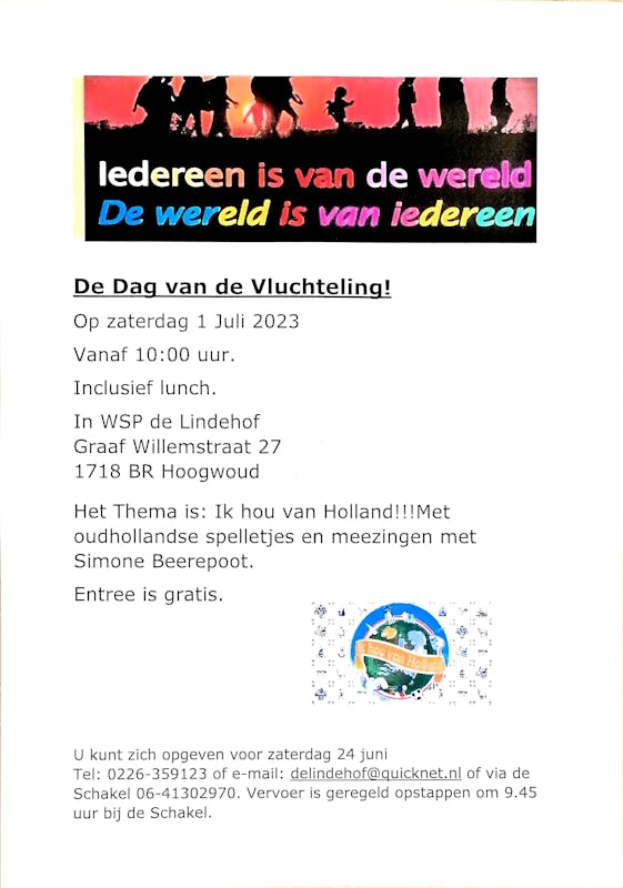 Zaterdag 1 juli organiseert WSP de Lindehof en WSP de Schakel De dag van de Vluchteling met als thema " Ik hou van Holland".Simone Beerepoot komt Nederlandse liedjes zingen en er kan Oudhollandse spelletjes gespeeld worden. Ter afsluiting is er een heerlijke "Hollandse" lunch. Waar: WSP de Lindehof Wanneer: zaterdag 1 juliTijd: 10.00 tot 14.00 uurGratis entree!