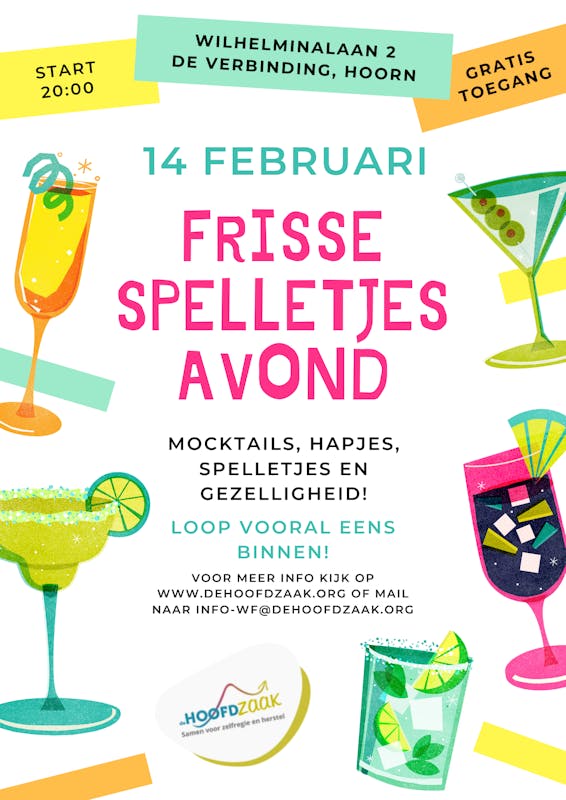 Vrijdag 14 februari aanstaande vindt er vanaf 20.00 uur bij De Hoofdzaak in Hoorn een spelletjesavond met een fris (alcoholvrij) karakter plaats. Heb je zin om in een gemoedelijke sfeer spelletjes te spelen? Aarzel dan niet en wandel gerust binnen! Opgeven is niet vereist. Mocht je meer info wensen, mail dan naar