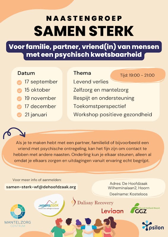 Samen Sterk is een succesvolle gespreksgroep voor naasten van mensen met een psychische kwetsbaarheid. Eens per maand komen we bijeen om aan de hand van een thema ervaringen, gedachten en gevoelens te delen. Ben je geïnteresseerd om in contact te komen met lotgenoten? Kijk dan op Samen sterk, lotgenotengroep voor naasten | De Hoofdzaak voor meer informatie en geef je op!