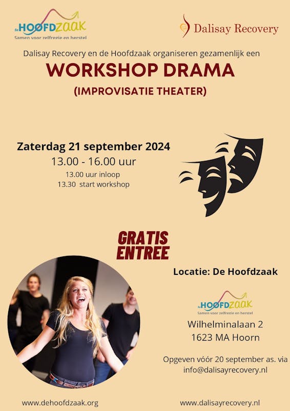 Op jezelf leren vertrouwen terwijl je schittert op het podium? Iedereen kan meedoen aan improvisatietheater. Je kunt niet fout doen en bovendien hoef je van tevoren geen moeilijk lange teksten te bestuderen. Het enige wat je hoeft te doen is komen en een beetje lef meenemen (of ontwikkelen 😊). Deze workshop is van 13-16 uur op locatie De Hoofdzaak. Aanmelden via
