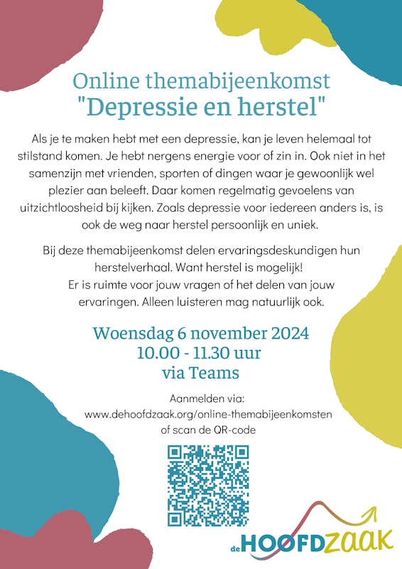 Bij deze themabijeenkomst delen ervaringsdeskundigen hun herstelverhaal op het gebied van depressie.
