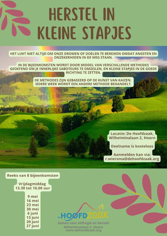 Het lukt niet altijd om onze dromen, wensen of doelen te bereiken omdat angsten en onzekerheden in de weg staan. In een reeks van 8 bijeenkomsten wordt door middel van verschillende methodes geoefend om kleine stapjes in de goede richting te zetten. Herstel in kleine stapjes wordt gegeven vrijdagmiddag van 13.30 tot 16.00 en start op 9 mei. Wil je meer weten of je aanmelden? Neem dan contact op met Renate: .