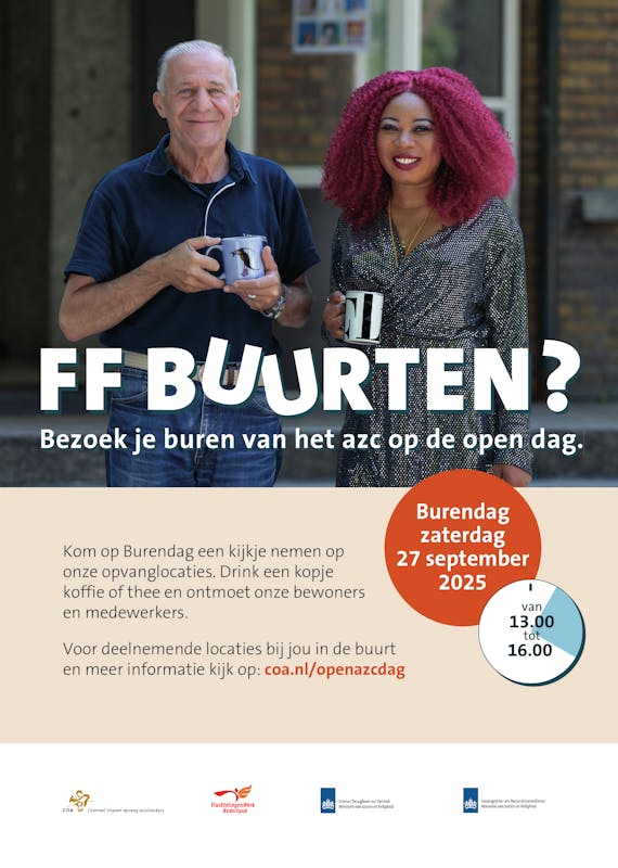 Op Burendag zetten wij de deuren van onze opvanglocaties open! 🌿 Kom gezellig langs voor een kop koffie of thee, maak kennis met onze bewoners en medewerkers, en ontdek hoe waardevol ontmoeting kan zijn. Tijdens de open dag krijg je de kans om sfeer te proeven, verhalen te horen en samen een leuke middag te beleven. Het is dé gelegenheid om even echt te buurten en elkaar beter te leren kennen!