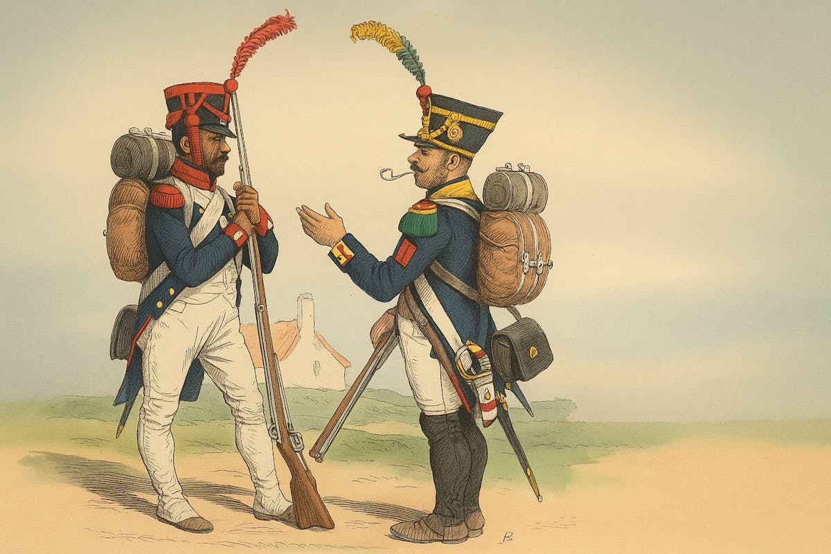 De afbeelding toont twee infanteristen van Linie: links een grenadier, rechts een voltigeur. Zij vormden de ruggengraat van Napoleons linietroepen (publiek domein – bron: Wikimedia).
