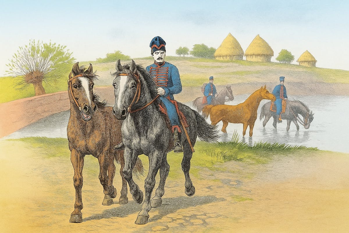 De afbeelding toont artilleristen bij het drenken van de paarden – een onmisbaar onderdeel van hun taak (publiek domein – bron: Wikimedia).