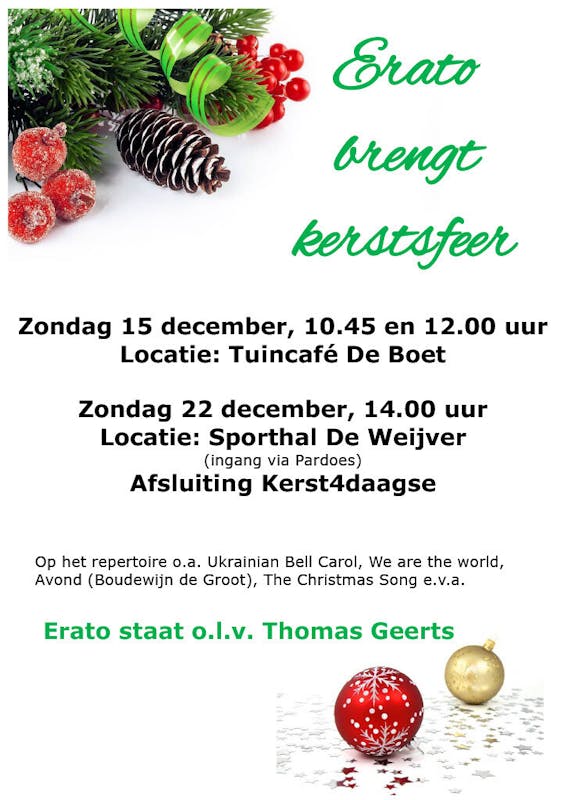 Erato o.l.v. Thomas Geerts speelt kerstmuziek en klassiekers uit de Top 2000. We doen dat in de kerstperiode 2x: