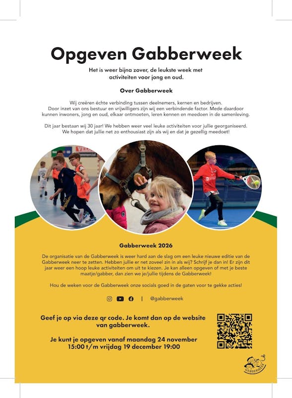 Het is weer bijna zover. De leukste week met de activiteiten voor de jeugd vanaf groep 3. Vanaf maandag 24 november rond 15 uur zal de inschrijving geopend zijn. Kijk op www.gabberweek.nl of scan de qr code op de flyer om naar de activiteiten te gaan.