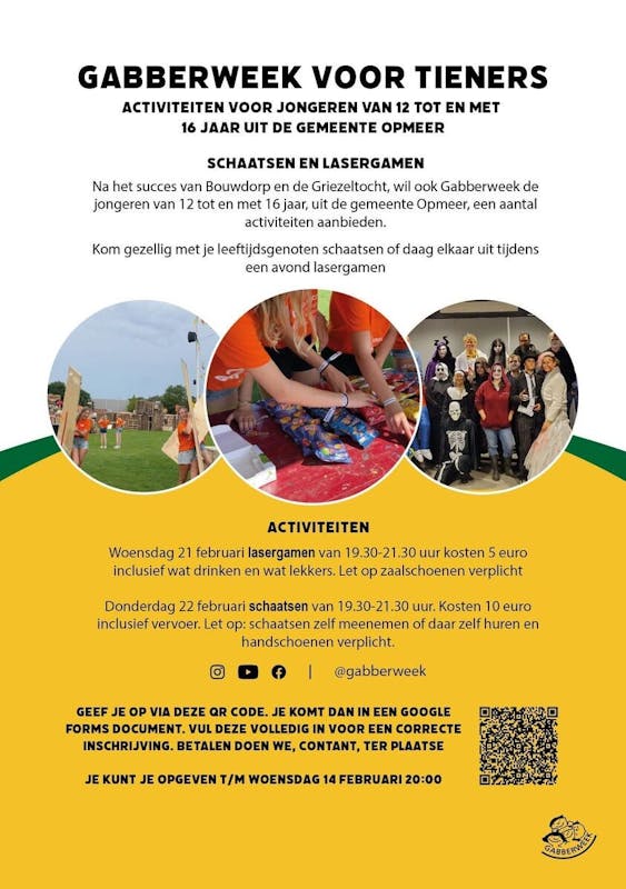 Een mooi initiatief van de Gabberweek voor de jongeren uit de gemeente Opmeer in de leeftijd van 12 tot 16 jaar. Geef je snel op via de QR code.