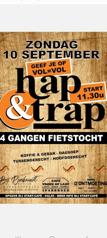 Hap & Trap 4-gangen Fietstocht. Zondag 10 september 2023. U START en eindigt in Spanbroek. U fietst langs D'Ontmoeting, De Goorn & Bij Rembrandt, H'H-waard. Aanmelden, meedoen? Bel ons. Meer informatie? Facebook en Instagram.