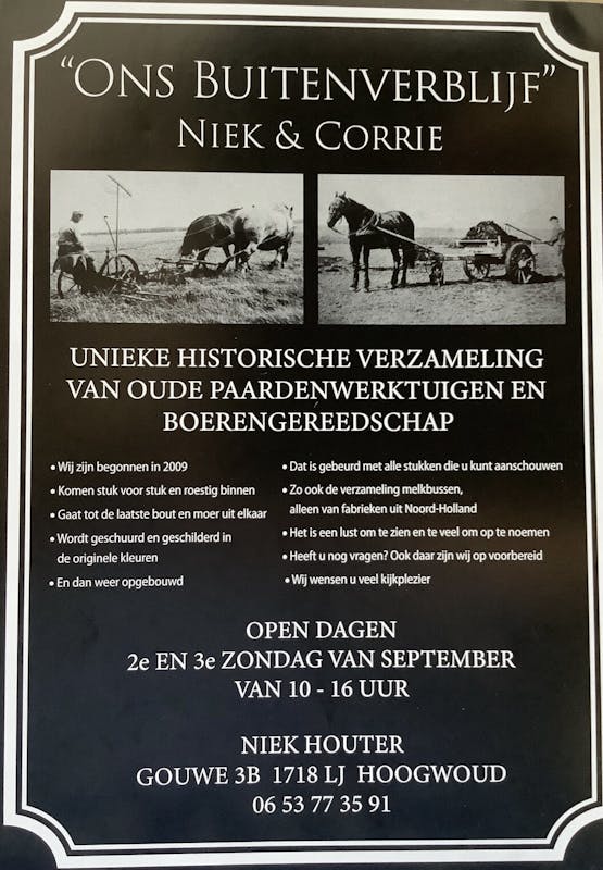 De Buurtverbinders, Marie Antoinette en Joke, brachten een bezoek aan Niek Houter, een enthousiaste en energieke 87-jarige die een bijzonder museum runt aan de Gouwe 3B in Hoogwoud. In 2009 richtten Niek en Corrie Houter dit museum op, waarin een indrukwekkende collectie oude paardenwerktuigen en traditioneel boerengereedschap te bewonderen is.