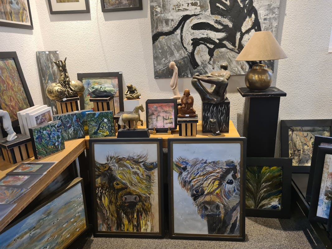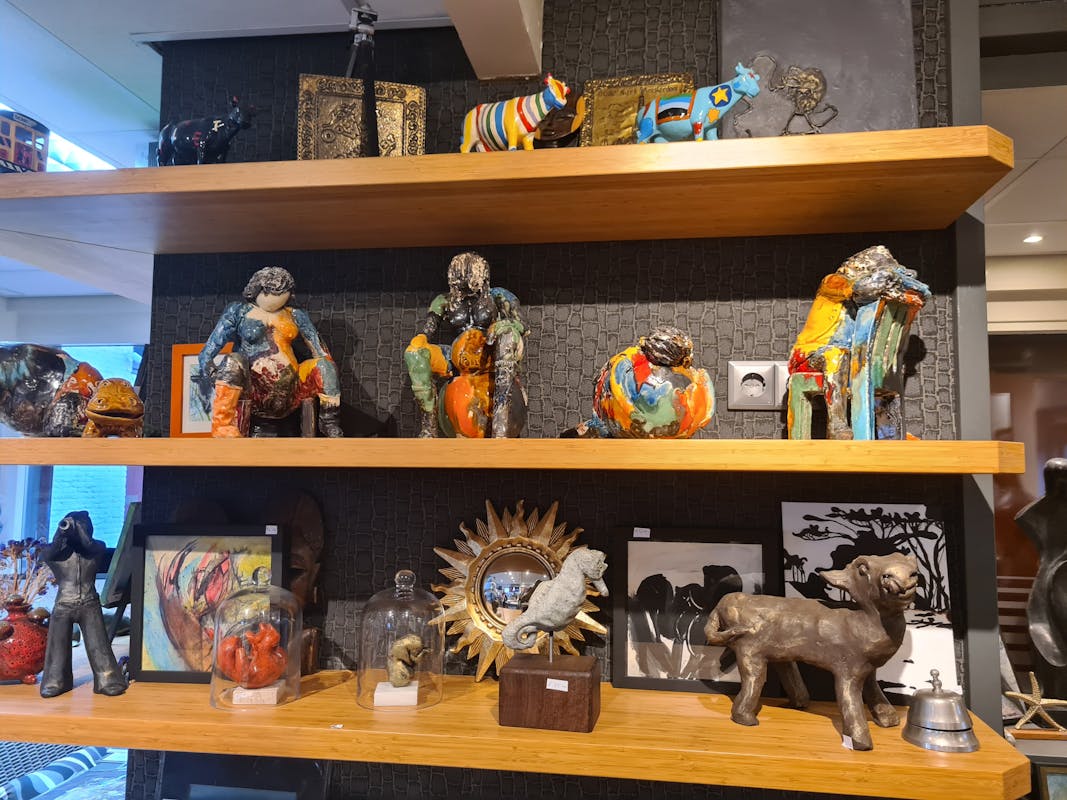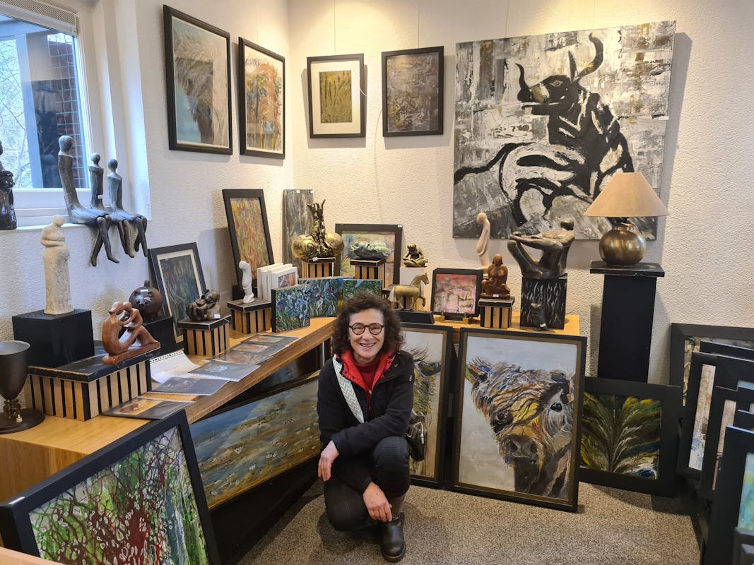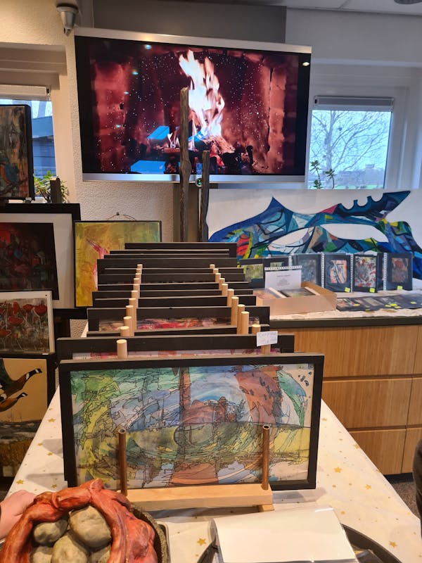 Margriet doet dit jaar voor de 1e keer mee aan de Kerstfair in Aartswoud en ik bezoek haar aan de Weelkade. Margriet begint te vertellen; ‘Ik vind het ontzettend leuk om mee te doen. Gisteren en vandaag heb ik al zoveel mensen gesproken en mooie complimenten gekregen. Ik geniet enorm van dit mooie evenement. Jarenlang was ik druk met mijn werk als verloskundige, de laatste 21 jaar vanuit mijn eigen praktijk hier aan de Weelkade. Dat heb ik altijd met ontzettend veel plezier gedaan. Sinds drie jaar ben ik gepensioneerd en kan ik mij volop bezig houden met mijn hobby. Zoals je ziet, maak ik beelden en acryl schilderijen. De lijsten van de schilderijen maak ik ook zelf. Daar ben ik soms langer mee bezig dan met het schilderij zelf. Het fijne van midden in de natuur wonen is dat ik zoveel inspiratie krijg om vogels, koeien, bloemen en mooie luchten te schilderen.’ Haar praktijk is nu atelier geworden en staat vol met prachtige schilderijen en beelden. Ook de schuur staat vol met mooie kunstwerken. Er is veel belangstelling van bekenden, merk ik. Veel gezinnen waar Margriet verloskundige was komen bij haar langs, ze begroet iedereen hartelijk met een knuffel en geeft een persoonlijke rondleiding. De zelfgemaakte beelden van de hoogzwangere en barende vrouwen in allerlei kleuren vallen veel mensen op. Ze zijn bijzonder en uniek om te zien. ‘Zelfgemaakt’, zegt Margriet trots. Joke, de partner van Margriet, vertelt dat er al 175 bezoekers zijn geweest. ‘Volgend jaar weer, het is zo leuk. Nu ik gepensioneerd ben, spreek ik veel minder mensen en dan is dit weekend zo leuk. Volgend jaar doe ik weer mee. Iedereen is van harte welkom!'