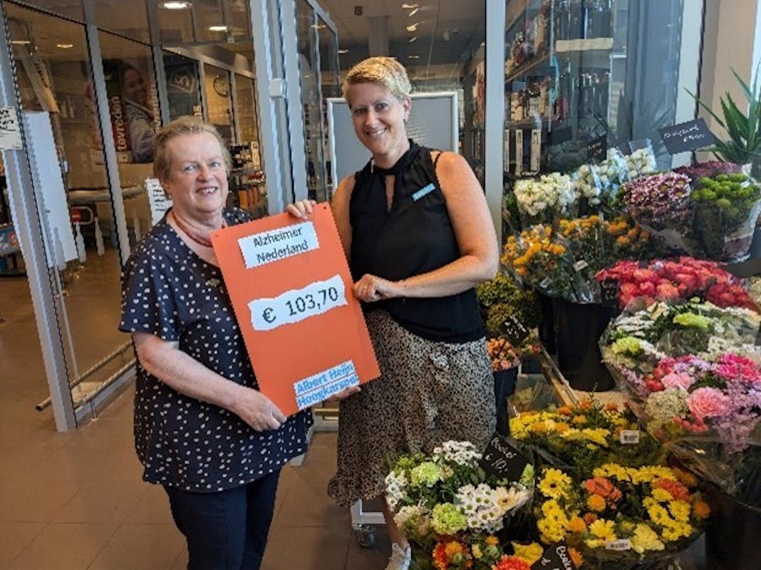 In de maand augustus konden de klanten van Albert Heijn Hoogkarspel hun statiegeldbonnetje doneren aan Alzheimer West-Friesland. Op 5 september jl. heeft manager service Wendy de opbrengst van deze actie overhandigd aan penningmeester Marion Nijhuis. De opbrengst van een maand statiegeldbonnetjes was 103,70 euro.