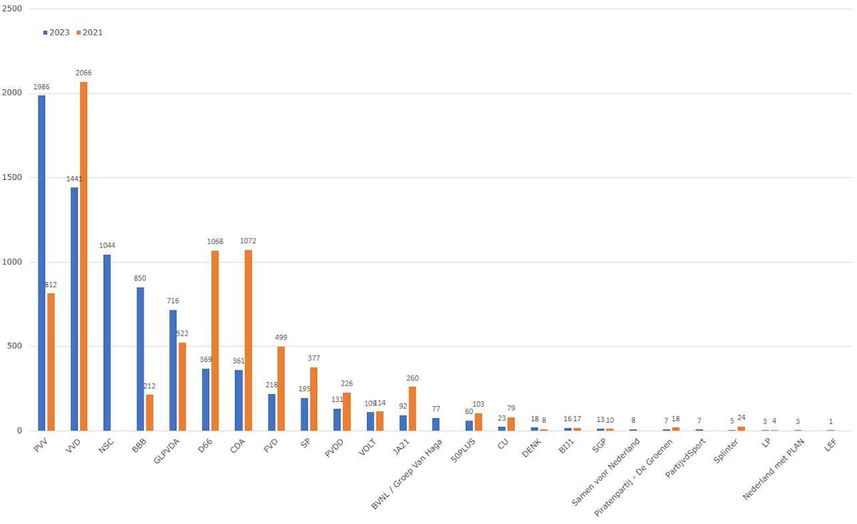 De voorlopige uitslag van de Tweede Kamerverkiezingen in de gemeente Opmeer is vastgesteld. Met 1.986 stemmen is de PVV ook in de gemeente Opmeer de grootste partij. De VVD volgt met 1.441 stemmen. Op de derde plaats staat NSC met 1.044 stemmen. Wilt u de uitslagen van alle partijen terugzien? Die kunt u vinden op http://www.opmeer.nl/voorlopige-uitslag-verkiezingen.