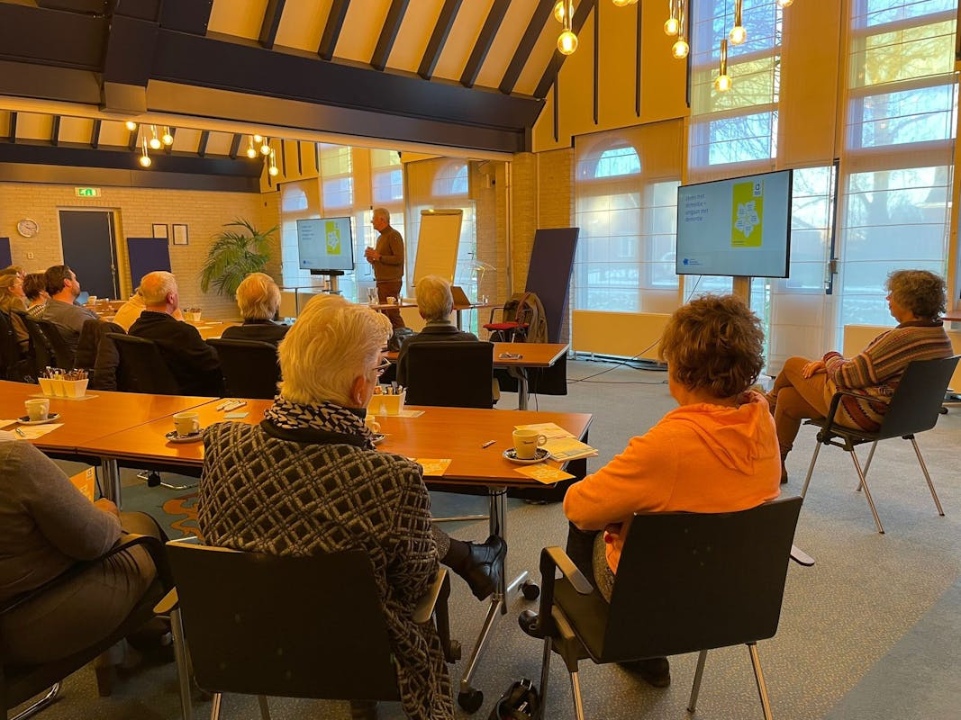 Gisteren was er een workshop Dementie voor vrijwilligers. De raadzaal zat vol met vrijwilligers vanuit diverse organisaties, zoals Lindehof, Weidehof, Golf met pit, Raad en Daad, Taalmaatje en Zonnebloem. Maar liefst 30 personen wilden er meer van weten. Vrijwilligers Auke en Hetty van Alzheimer West-Friesland vertelden over hun ervaringen en kennis (mede door hun beroep; adviseur bij vrijwilligerspunt en huisarts) en lieten de cursisten ook ervaren wat je wel en niet kan zeggen en doen. Methode GOED (Geruststellen, Oogcontact, Even meedenken en Dankjewel) werd uitgelegd en ervaren.